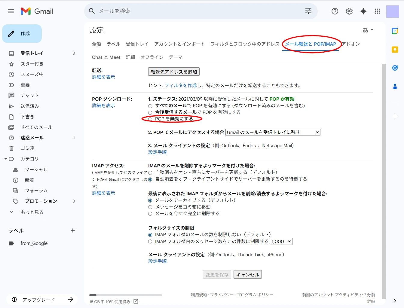 POP3S、OP25B、SMTPS、OAuth2 にチェックを入れるのがセキュリティ対策である。 POP3 接続では受信後サーバーからメールを削除するのが基本なので、削除するまでの日数も設定している。Gmail アドレスの容量は、グーグル・ドライブ、グーグル・フォトを合わせて 15GB あるので、長めに設定しているが、会社や一般のプロバイダ、レンタル・サーバーのメール・アドレスでは、容量が 1~5GB なので、30 日くらいが適切であろう。